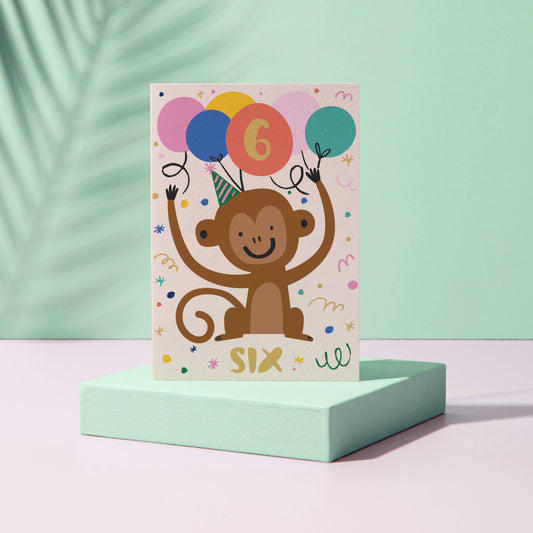 Age 6 Birthday Card – Monkey Theme – Number Card for Kids – Six Years Old
