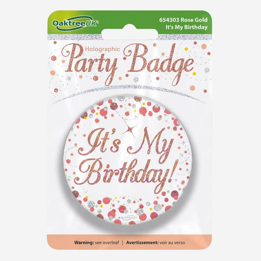 It's My Birthday Sparkling Fizz Rose Gold Holographic Party Badge