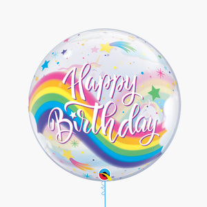 Birthday Rainbow Unicorns Balloon is perfect gift for any unicorn enthusiast. This balloon is pre-decorated with a pretty rainbow swirl design with unicorns, shooting stars and clouds. It is perfect as a centrepiece at a Rainbow themed party.  Mix it alongside brightly colour latex or foil balloons to create a stunning display.