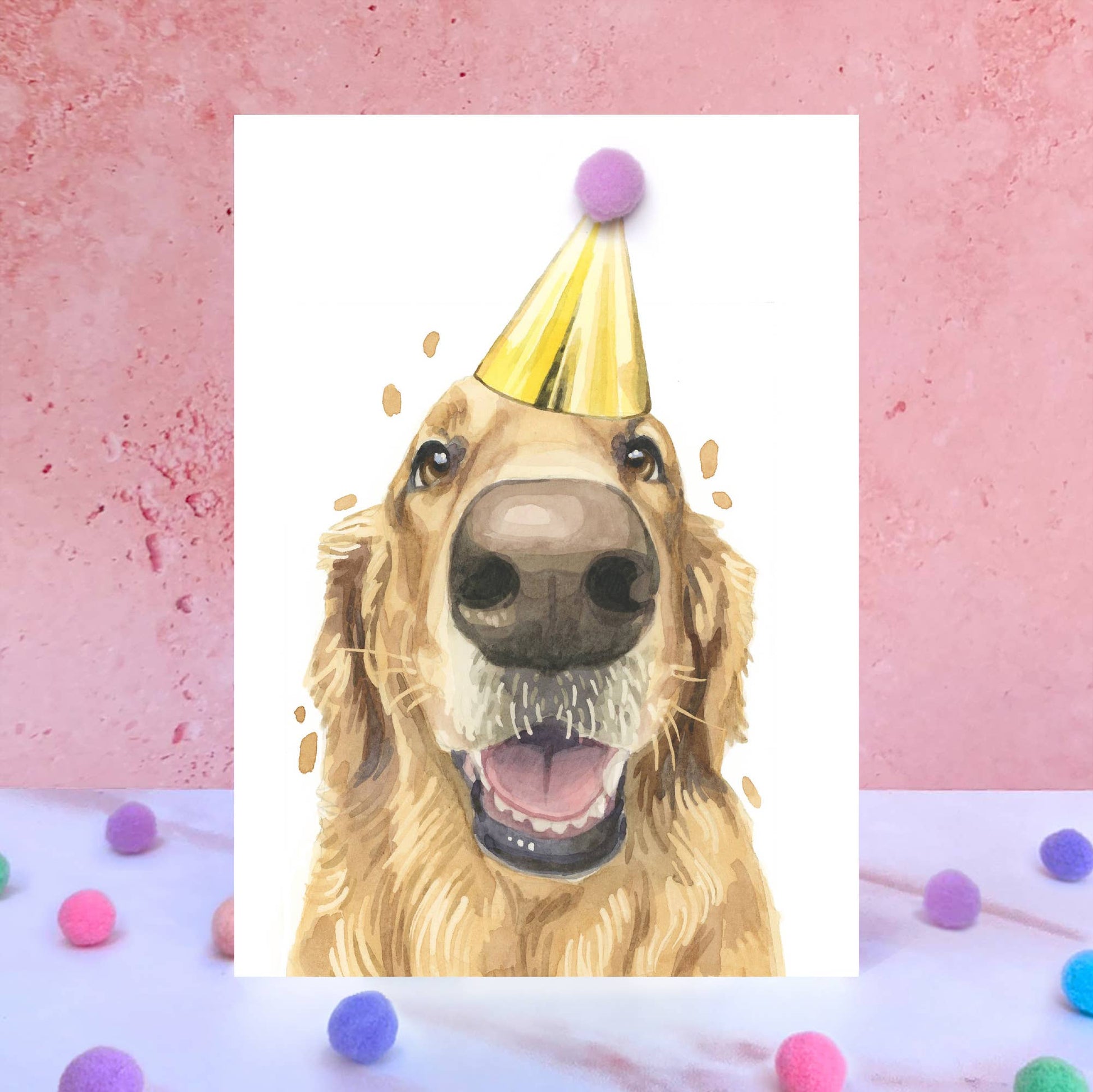 Golden Retrievers will stop at nothing to discover a snack, this involved sticking their nose into everything. Here's my fun painting turned into a beautiful high quality card, that will bring a smile to anyone's face. Give the gift of Stella the Golden Retriever's beautiful nose to any of your dog loving friends and family with this unique and beautiful card, featuring a 12mm pompom which adorns her party hat! This greeting card is perfect for any dog lover's birthday, or any occasion that warrants a celebration! The cards come individually wrapped in cellophane and are printed on premium quality, FSC-certified 350gsm thick card, featuring a high quality print of an original watercolor painting by the artist Robert James Hull, hand embellished with a beautiful and modern coloured pom pom (pom pom colours vary, so please specify if you have a choice from the available colours you can see on my page - light pink, dark pink, purple, orange, teal, or blue).