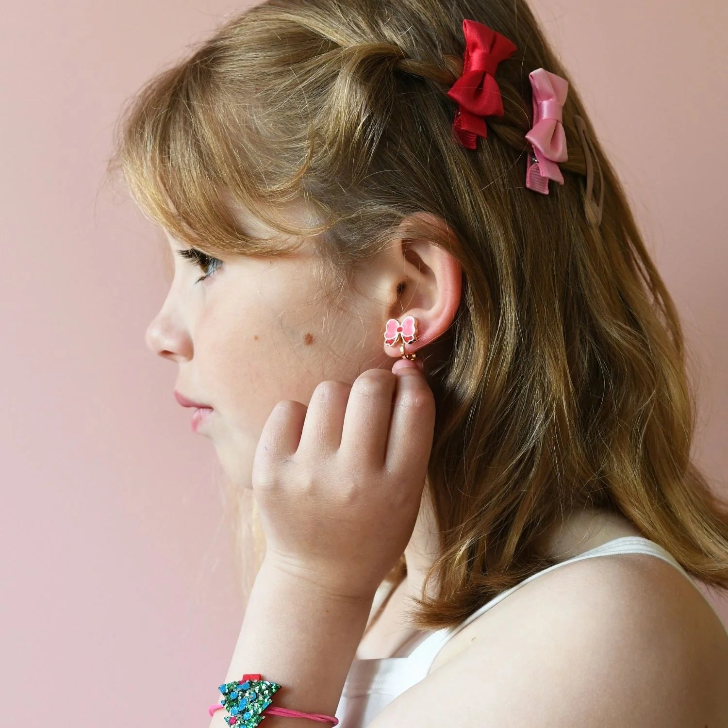 Add a sprinkle of festive magic with the Jolly Christmas Clip-On Earrings! This adorable set of four includes cheerful reindeers, sparkling Christmas trees, twinkling gems, and sweet pink bows—each set on gentle gold-tone metal clipsdesigned specially for little ears. No piercing needed, just clip on and get ready to celebrate in style!