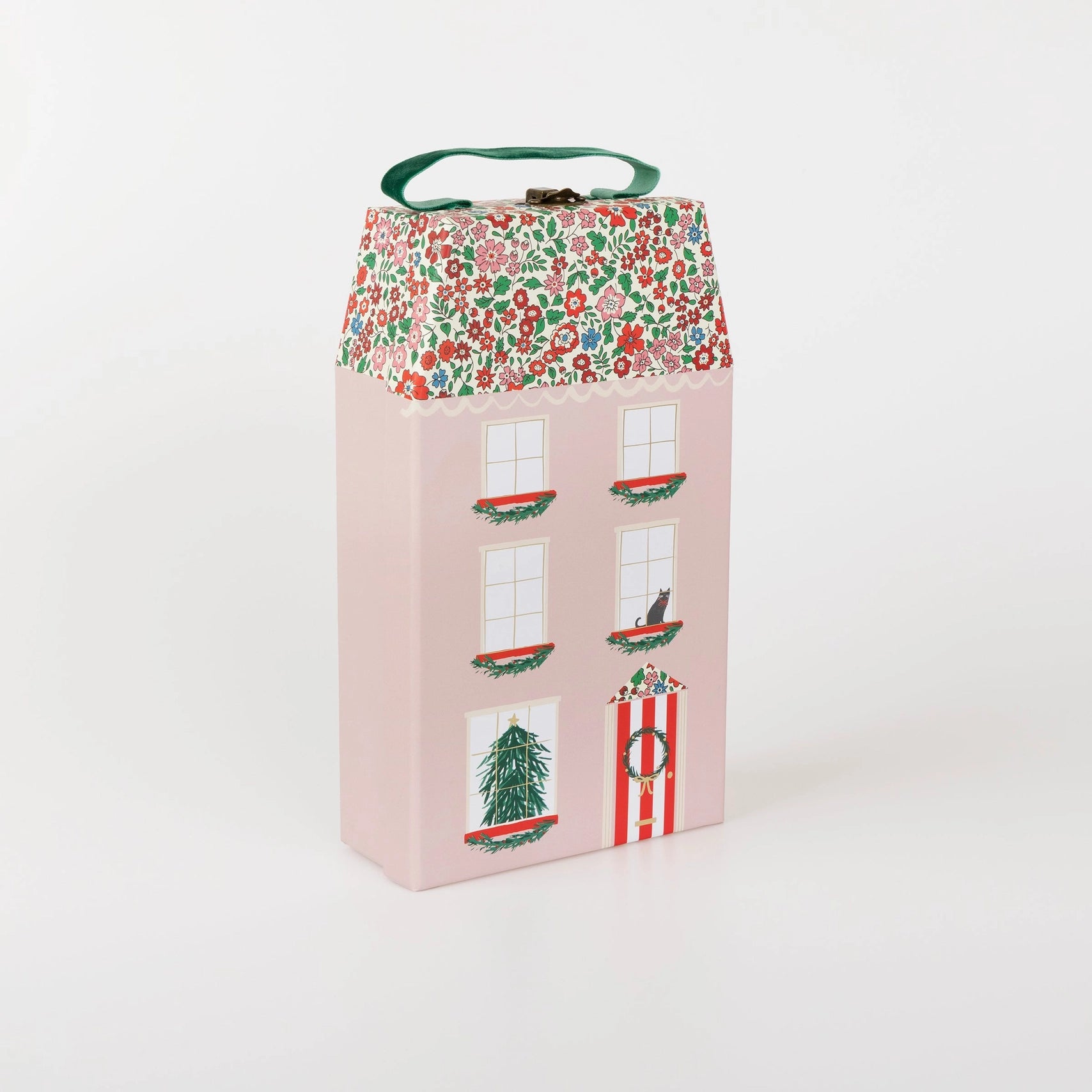 We've collaborated with Liberty to bring you the most elegant Christmas advent calendar, designed to decorate, accessorise and make the Christmas countdown extra special. This enchanting suitcase-style paper house features a joyful Liberty floral print roof, luxurious green velvet ribbon handle, burnished brass closure, and clever festive illustrations, perfect to display on a table or mantel for a stunning effect. Open to reveal numbered doors, with Liberty floral prints. Inside the first door is a gold tone chain bracelet, with the rest each containing a captivating charm to culminate in a stunning piece of jewellery to wear on Christmas day and beyond. Reuse the suitcase as a charming storage box for your most precious belongings. Driven by discovery, Liberty has been home to the artistic shopper since 1875. Famed for its directional design and celebration of craftsmanship, its prints are created in the heart of London by the Liberty design studio.