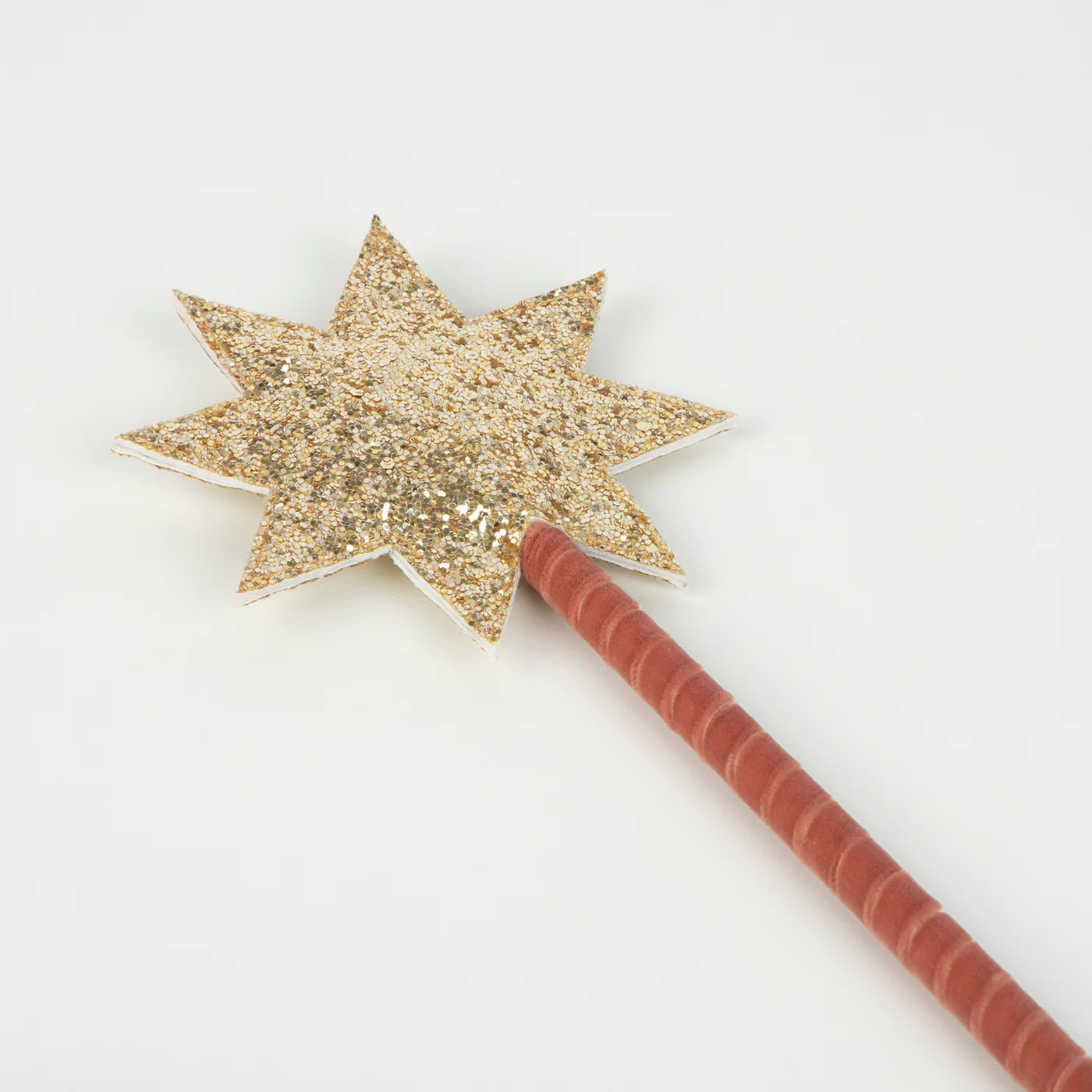 • The wand is topped with a gold glitter fabric star, and has a pink velvet ribbon wound around the wooden handle