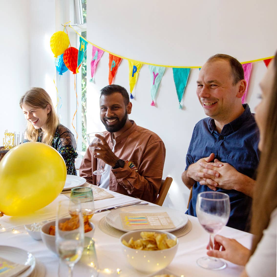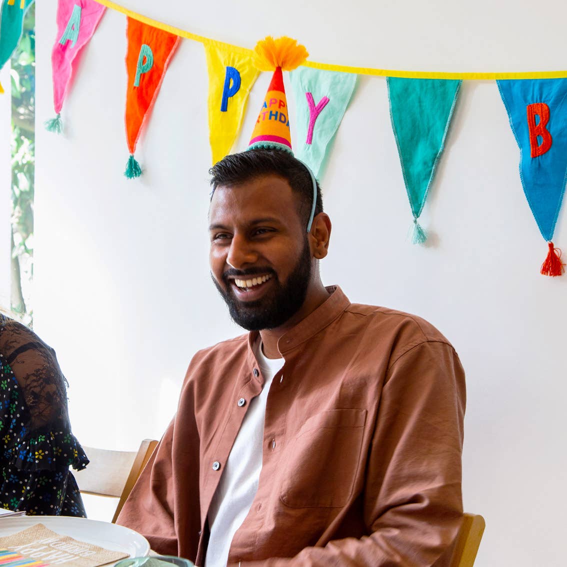 Multicoloured Rainbow Happy Birthday Bunting by Talking Tables. This reusable and washable fabric bunting is handmade from sustainably sourced 100% cotton with pennants spelling out 'Happy Birthday'. Perfect for kids and adults, hang up for your next birthday party and reuse indoors or outside, year after year. Size: 3m (118in) with 12 pennants