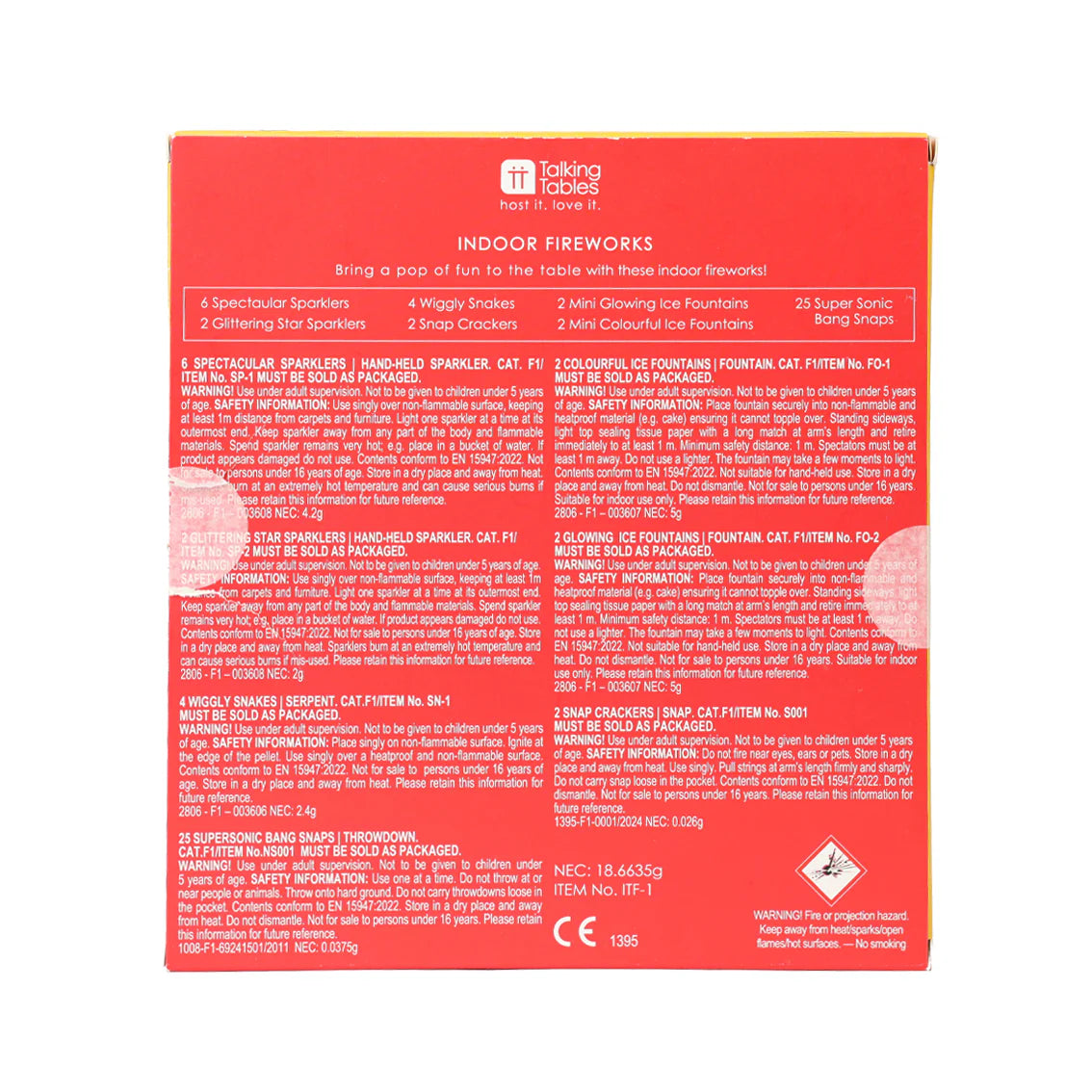Contents: 6 spectaular sparklers, 2 glittering star sparklers, 4 Wiggly Snakes, 2 snap crackers, 2 Mini Glowing Ice Fountains, 2 Mini Colourful Ice Fountains, 25 Bang Snaps